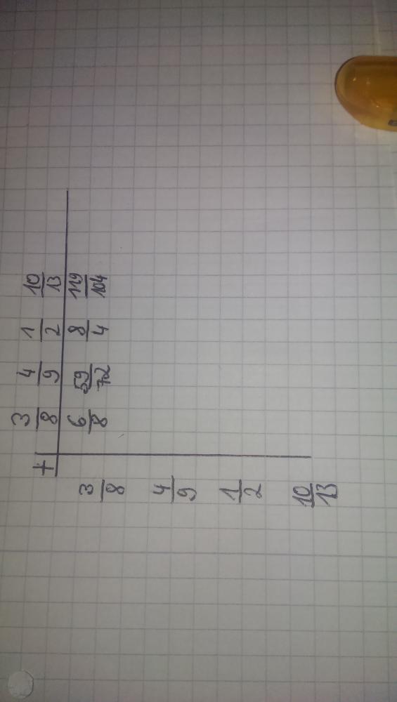 3/8 + 4/8 = 7/8 (da hast Du falsch von der Tafel abgeschrieben)3/8 + 10/13 = ?