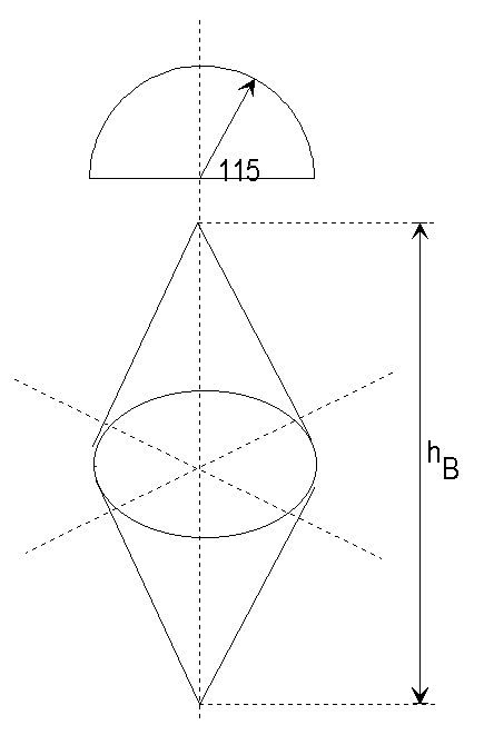 Dann ist da ein Halbkreis mit so dem Radius 115 cm und unter dem Halbkreis sind dann so zwei Kegel, aber sie stehen Grundfläche an Grundfläche sprich der eine steht 180 Grad umgedreht da.