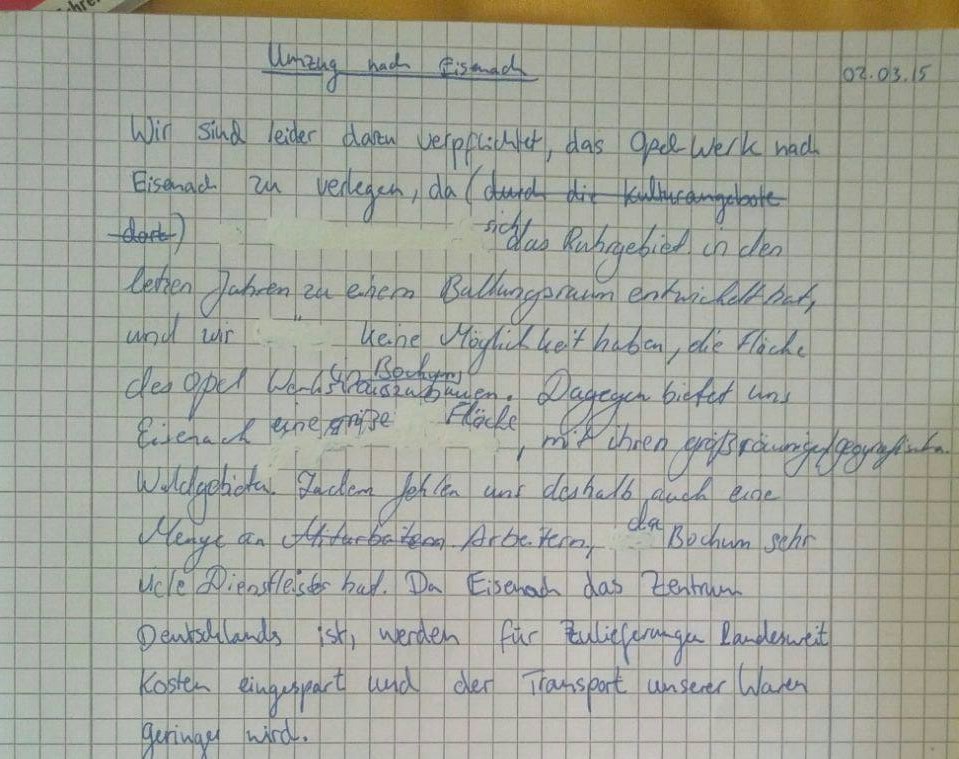 wir machen in Erdkunde gerade Bochum und es geht um den Umzug des Opel Werks von Bochum nach Eisenach. Nun müssen wir eine Rede schreiben, die der Unternehmensführer des Opel Werks dem Bochumer Volk vorträgt, da diese natürlich ihr Opel Werk behalten wollen.