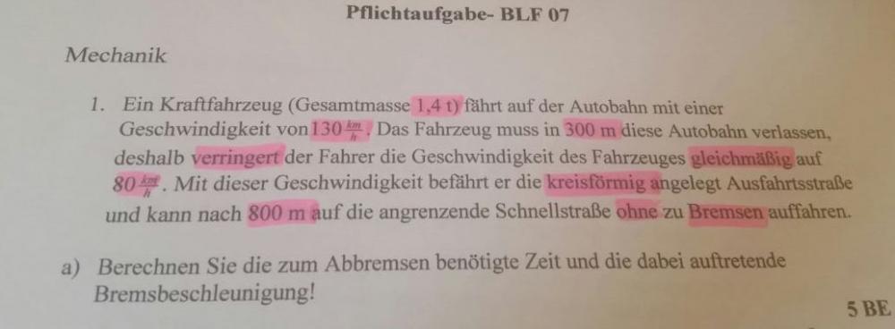 Im Aufgabenteil a) ist nur nach dem Abbremsen gefragt. Das passiert nach dem Text nur auf 300 m auf der Autobahn. Auf der folgenden kreisförmigen Ausfahrtsstraße wird nicht mehr gebremst.