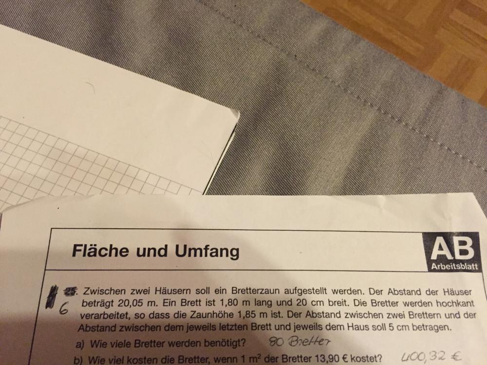 Zwischen 2. Häusern soll ein Bretterzaun aufgestellt werden. Der Abstand der Häuser beteägt 20,05m ein Brett ist 1,80m lang und 20cm breit. Die Bretter werden hochkant verarbeitet sodas der Zaun 1.85m hoch ist. Der Abstand zwischen zwei Brettern und der Abstand zwischen dem jeweils leztzen Brett und jeweils dem Haus soll 5cm betragen.