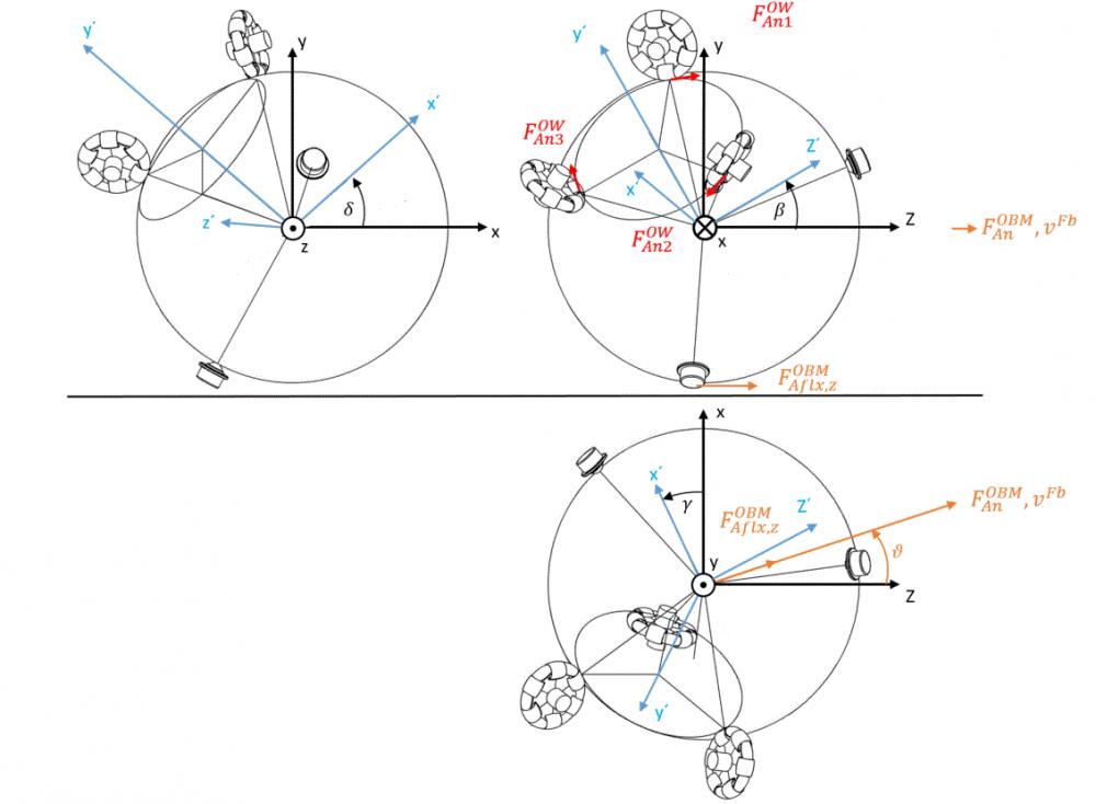 Hallo zusammen! Ich möchte mit drei tangentialen Kräften, die in einer Ebene Liegen und deren Angriffspunkte um 120° versetzt sind, eine Kugel antreiben. Deren Kontaktpunkt mit der Straße soll am Umfang der Kugel frei wählbar sein. Sozusagen, soll die resultierende Kraft der drei einzelnen Tangentialkräfte meine Antriebskraft sein, die mit dem Hebelarm R wirkt. Jetzt bin ich nicht der rießige Matrizen und Vektoren Spezialist (und das ist noch untertrieben), aber vielleicht kann mir jemand sagen ob ich auf dem richtigen Weg bin.