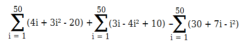 [TEX]\sum_{i=1}^{50} (4i + 3i^2 - 20) + \sum_{i=1}^{50} (3i - 4i^2 + 10) - \sum_{i=1}^{50} (30+7i -i^2)[/TEX]