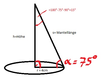 Mit dem Winkel Alpha und dem Radius r Kannst du die Mantelläange s ausrechnen.